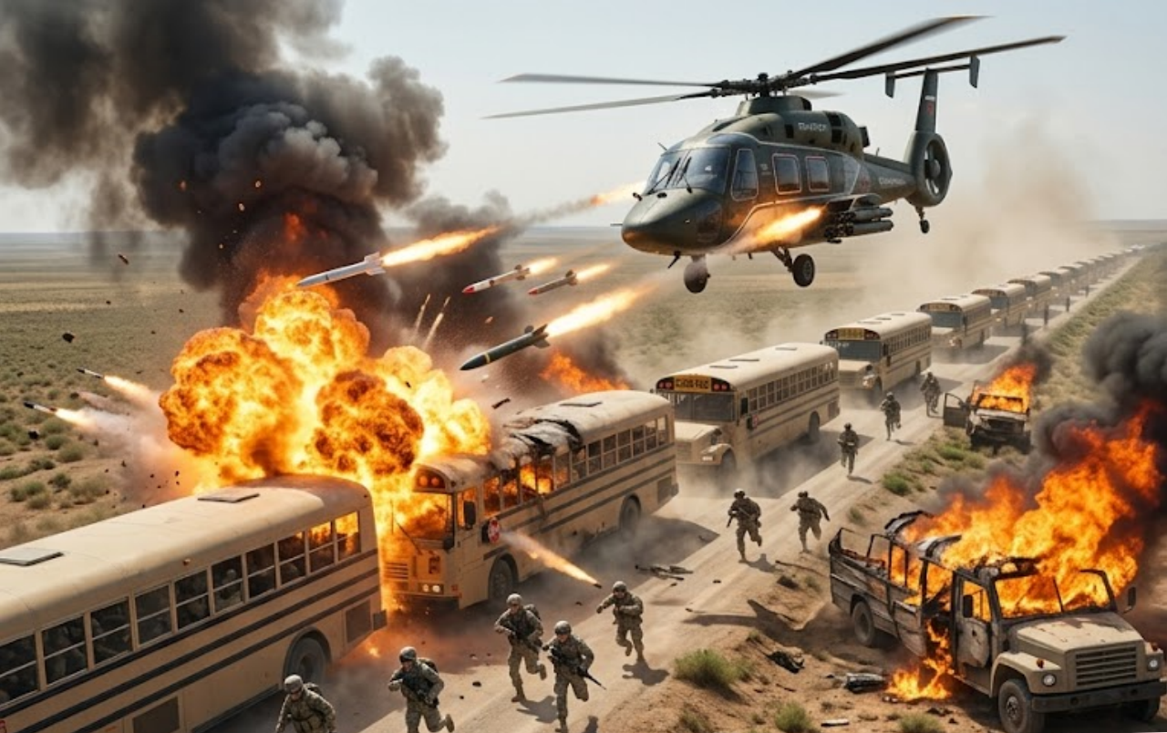 Explosions ripped through the line of vehicles as buses were struck one after another. Thick black smoke billowed into the sky, and flames quickly engulfed multiple वाहनों. Survivors, if any in this scenario, would have had little time to react as the attack unfolded with speed and intensity.