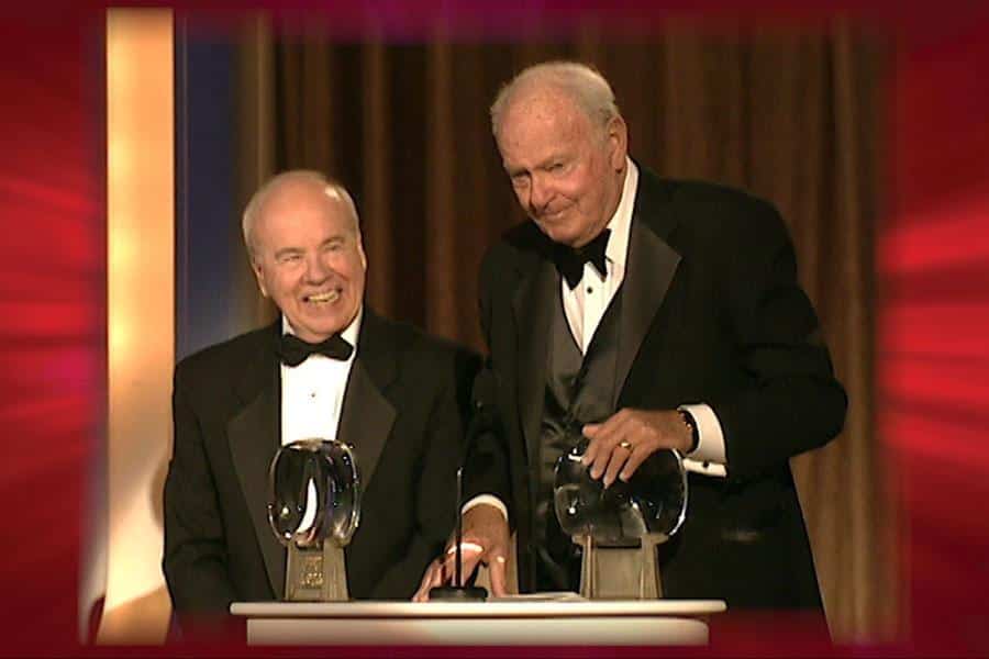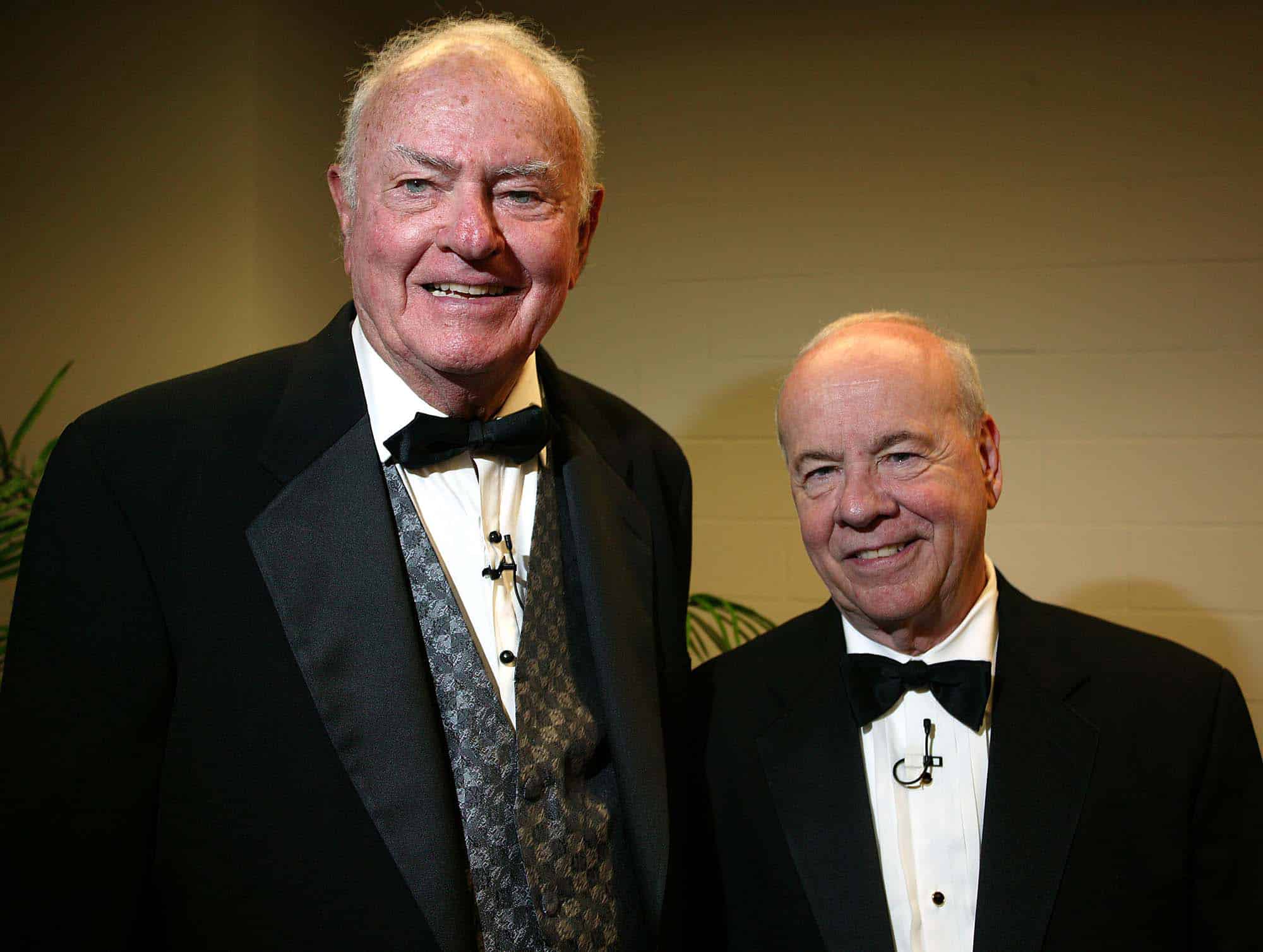 TV Emmy award winner, Harvey Korman, left, and Tim Conwaypose together after performing at University of Texas at Tyler in this 2004 photo. Korman, the tall, versatile comedian who won four Emmys for his outrageously funny contributions to “The Carol Burnett Show” and played a conniving politician to hilarious effect in “Blazing Saddles,” died Thursday, May 29, 2008. He was 81. (AP Photo/Dr. Scott M. Lieberman)