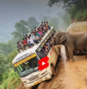 Experience a gripping AI-generated photorealistic 4K video showing a crowded Indian AC bus stuck on a narrow, treacherous muddy cliffside road. Watch as a powerful elephant aggressively pushes the damaged bus precariously toward the cliff edge, while passengers anxiously cling to the windows and roof. Set against misty valleys, swaying green trees, and an overcast sky, this dramatic scene captures the danger and tension of mountain road travel in India. Perfect for wildlife, travel, and AI art enthusiasts.