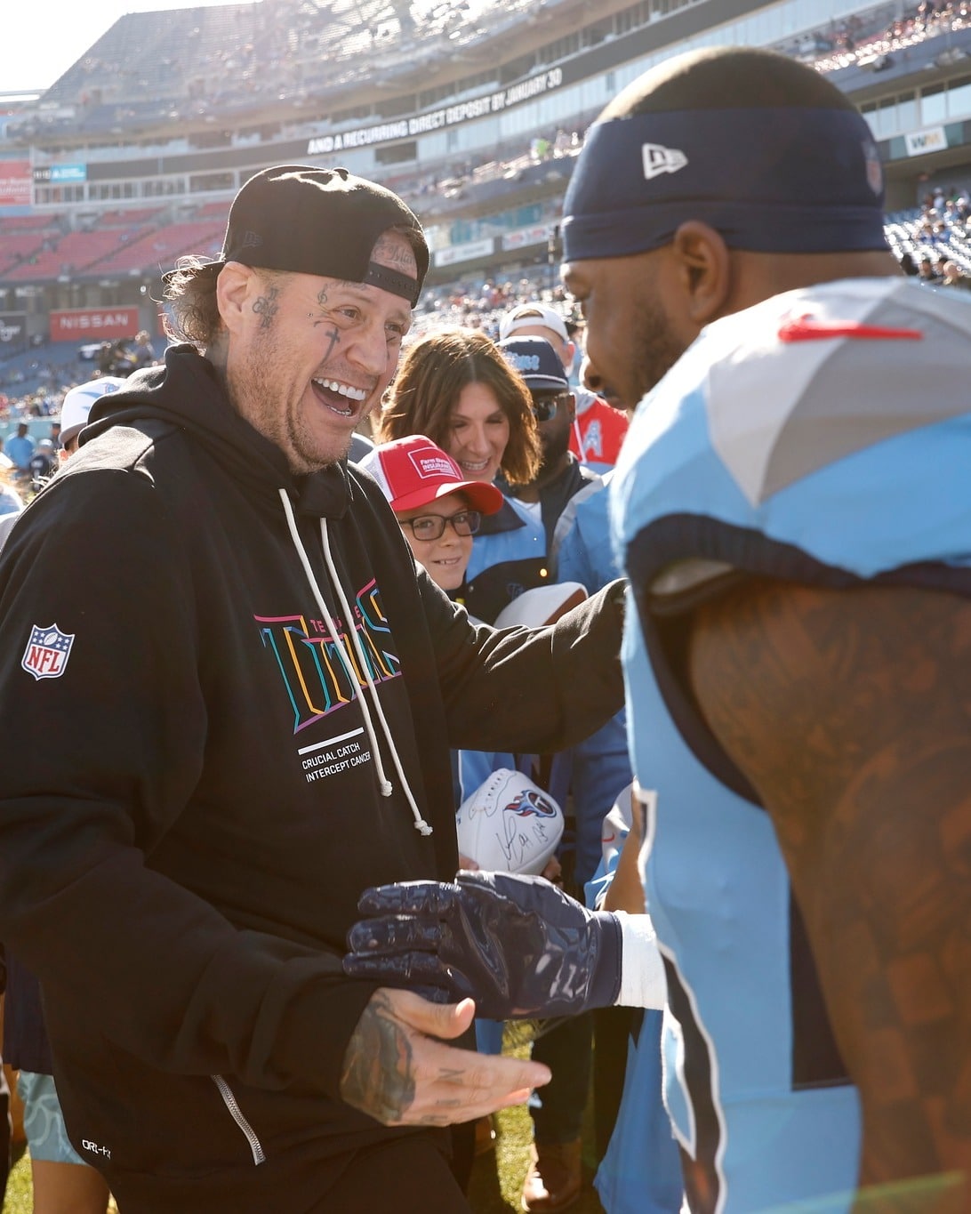 At Nissan Stadium, Jelly Roll mingled with fans, enjoyed the atmosphere, and posted game-day moments on social media. His clean-shaven face highlighted a brighter, more polished look while still keeping the down-to-earth charm that has made him one of the most relatable figures in modern music.