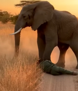 An adult lion drags a park ranger across the ground by his torn jacket sleeveβnot biting fleshβwhile tourists shout for help. Seconds later, a massive African elephant charges in, trumpeting, and delivers a powerful shoulder hit that knocks the lion several meters away. The elephant immediately stands guard, shielding the ranger and nudging him toward a nearby jeep. The lion retreats into the tall grass as dust glows in the golden light. Captured in one continuous 9:16 handheld shot with natural ambience.