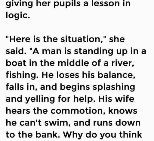 A fourth-grade classroom was unusually quiet as the teacher announced it was time for a lesson in logic. She paced slowly in front of the chalkboard, clearly enjoying the setup. “Here’s the situation,” she said. “A man is standing in a boat in the middle of a river, fishing. He loses his balance, falls in, and starts splashing and yelling for help. His wife hears the noise, knows he can’t swim, and runs down to the riverbank. Why do you think she ran to the bank?”