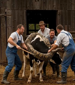 A terrifying moment unfolded when a massive python suddenly wrapped itself around a helpless dairy cow. The farmers rushed in with sticks and shovels to rescue the animal. What happened next was a shocking yet heroic struggle to save one of their own.