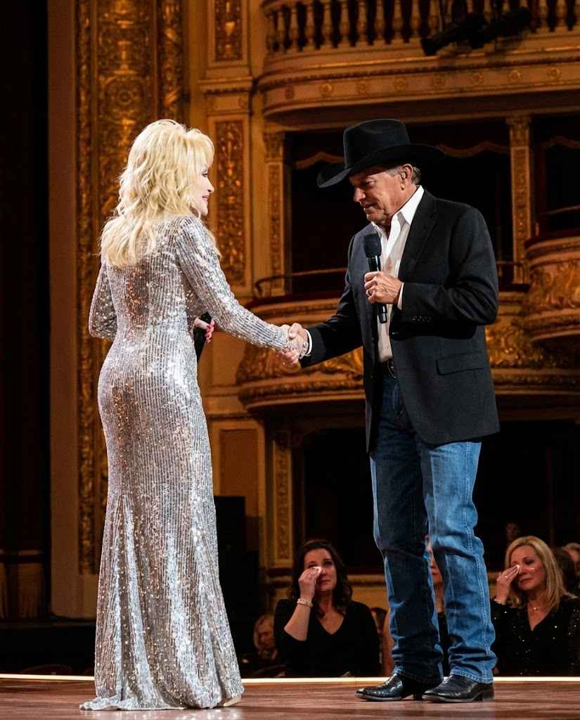 As George Strait began to sing, his approach was slower and deeper than usual. Each lyric seemed to emerge from the depths of his memory, evoking a sense of reflection. Strait’s voice, rich and resonant, carried the weight of years spent honing his craft. The choice of song felt deliberate, as if he were sharing a personal story rather than merely performing. Dolly Parton, with her small stature and larger-than-life presence, inclined her head, listening intently. This moment was not rushed; it was a shared experience, a conversation through music.