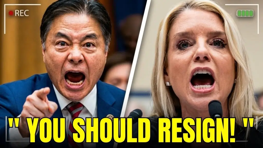 Lieu began his interrogation by projecting two photographs onto the chamber screens—images of a sex-trafficking victim alongside high-profile associates of Jeffrey Epstein. The strategy was surgical. By confirming that Bondi’s department had redacted the victim’s face in accordance with congressional law, Lieu forced the Attorney General to acknowledge the status of the individual in the photo as a verified victim of a federal crime.